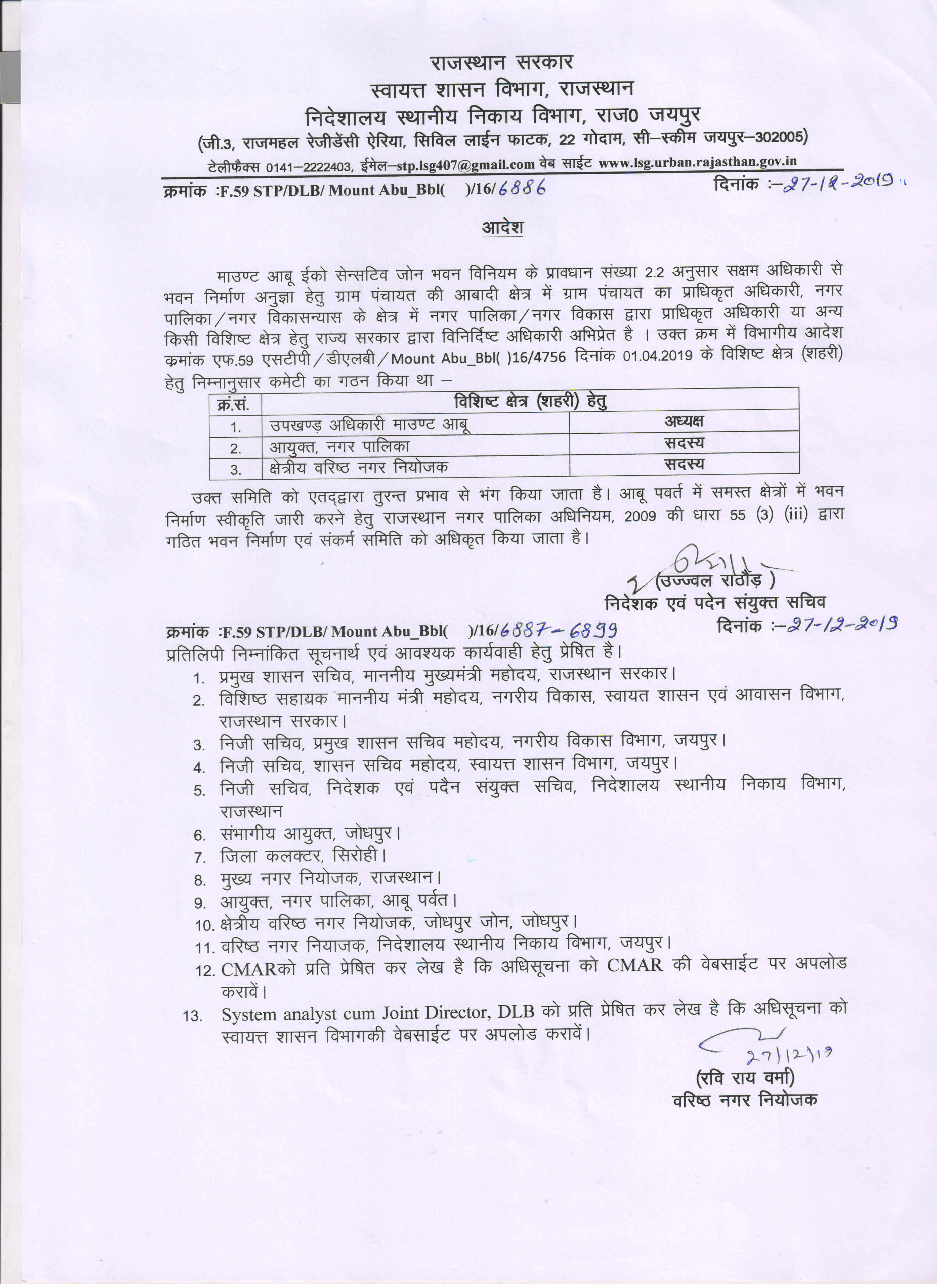 | माउंट आबू भवन विनियम के अंतर्गत विशिष्ट क्षेत्र (शहरी) हेतु समिति के गठन से सम्बंधित आदेश क्रमांक 6886 दिनांक 31-12-2019 | view | |
