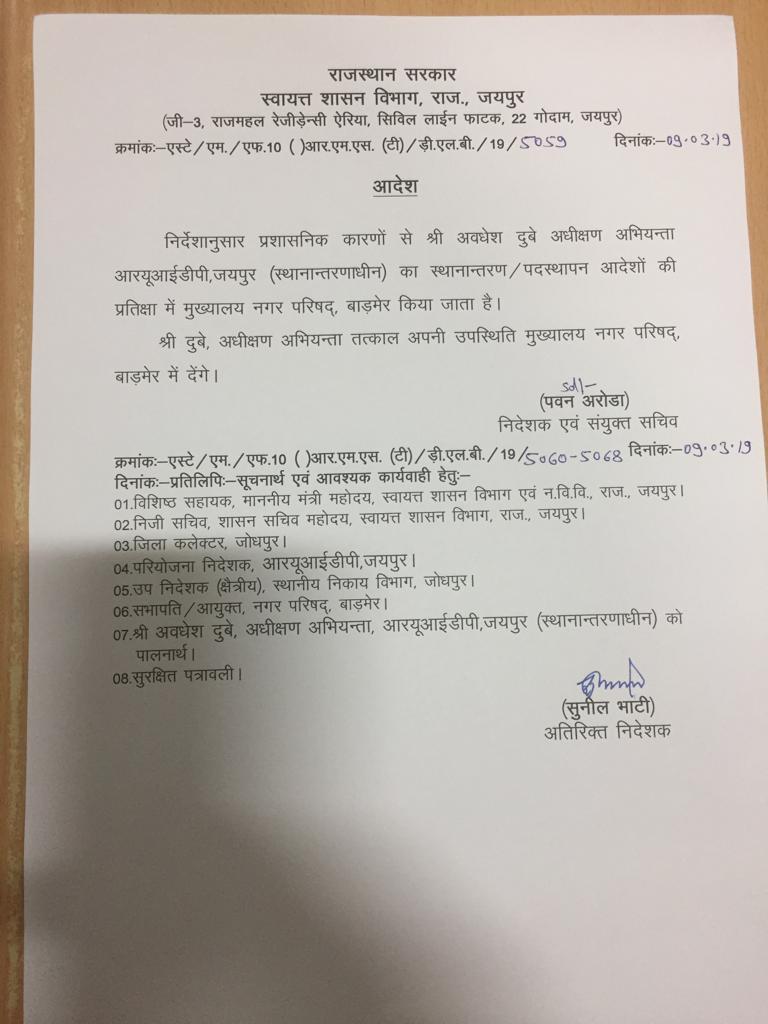 | श्री प्रताप सिंह, अधिशाषी अधिकारी, नगर पालिका रानी(पाली) को तत्काल प्रभाव से APO किये जाने हेतु आदेश क्रमांक 13391 दिनांक 11-12-2019 | view | |