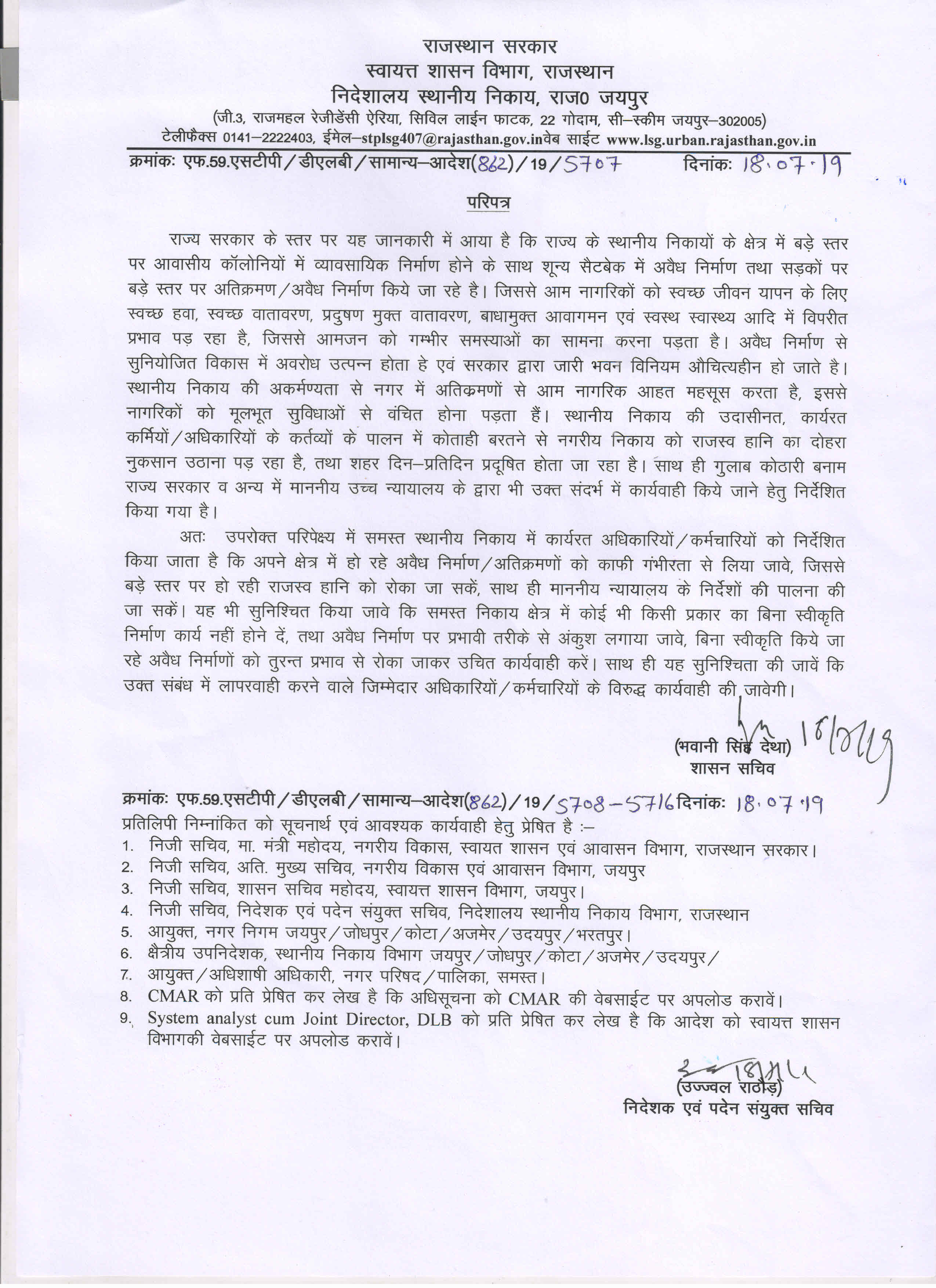 | मास्टर प्लान के नगरीय क्षेत्र (परिधि नियंत्रण पट्टी) मे स्तिथ राजस्व ग्राम की आबादी से 500 मीटर की परिधि क्षेत्र में आवासीय, शैक्षणिक, चिकित्सा आदि उपयोग अनुज्ञेय किये जाने के सम्बन्ध क्रमांक 6103 दिनांक 20-09-2019 | view | |