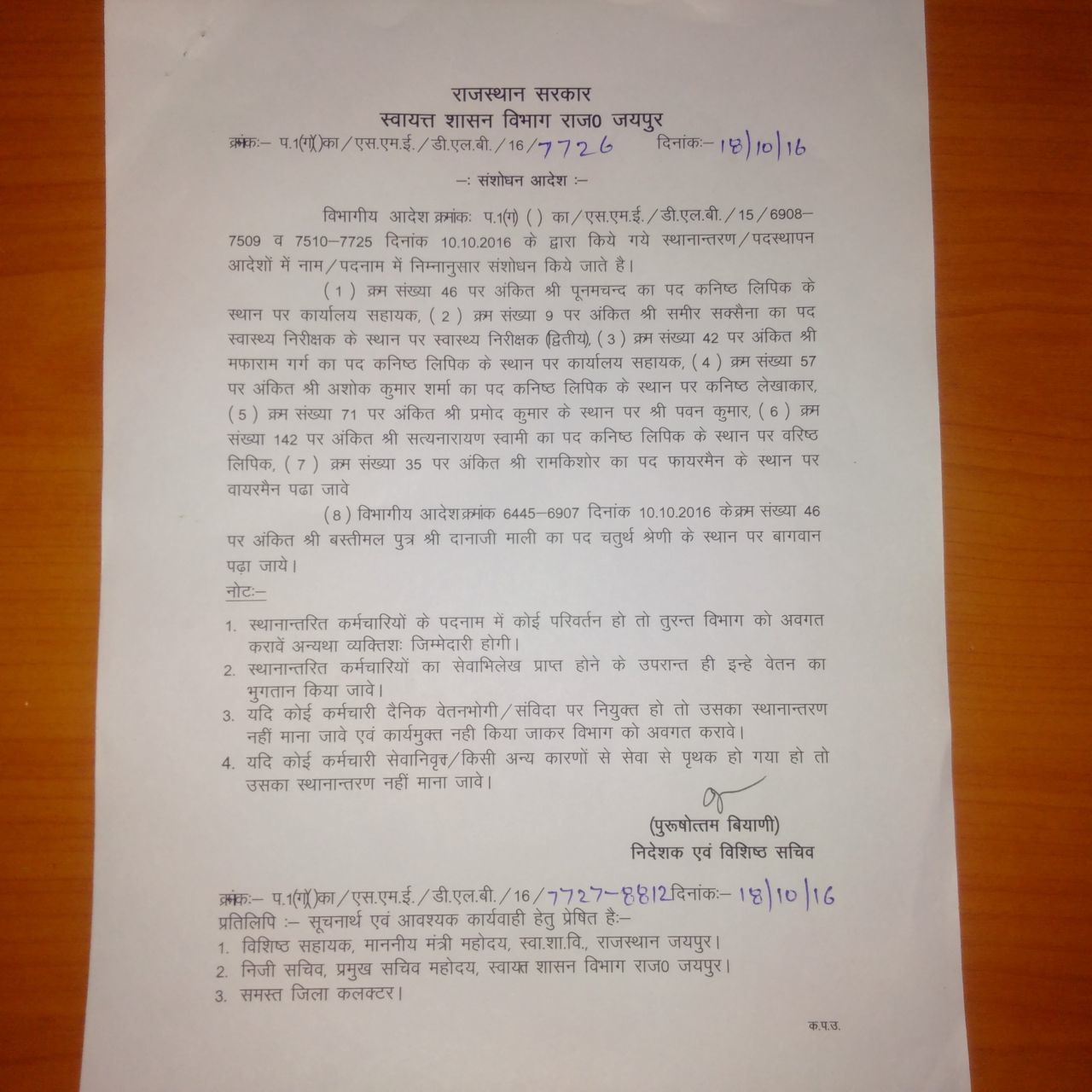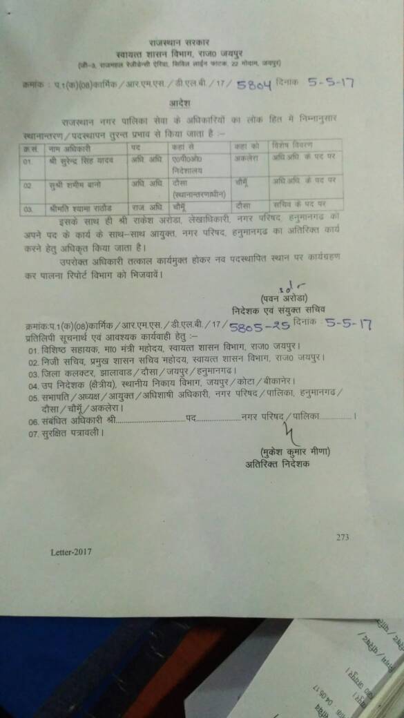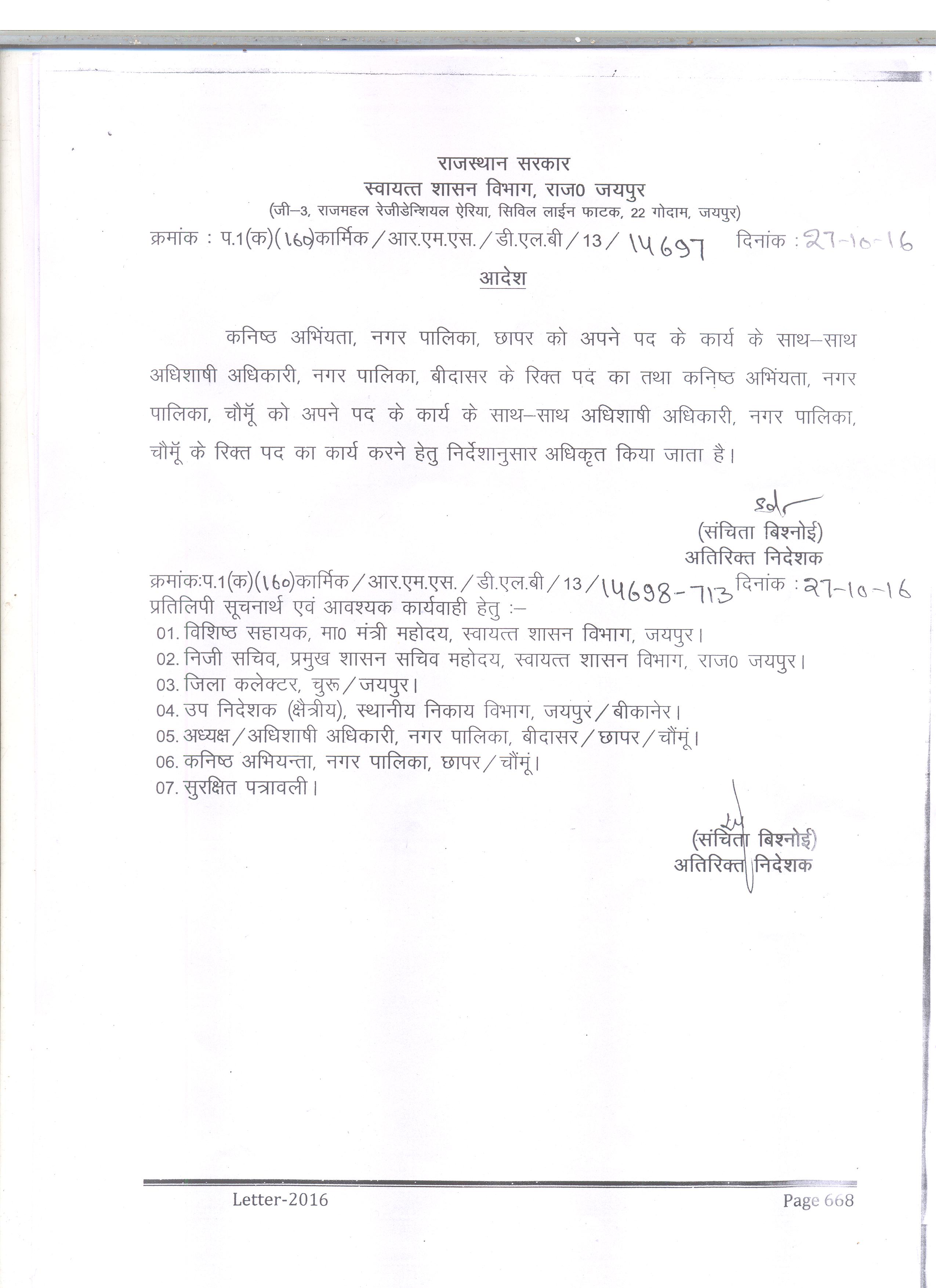 | 37 | Rajasthan with regard to the promotion of officials of the municipality C.C.A Rule 17 regarding the information order no.5928-34 date 7-4-2016 | View |