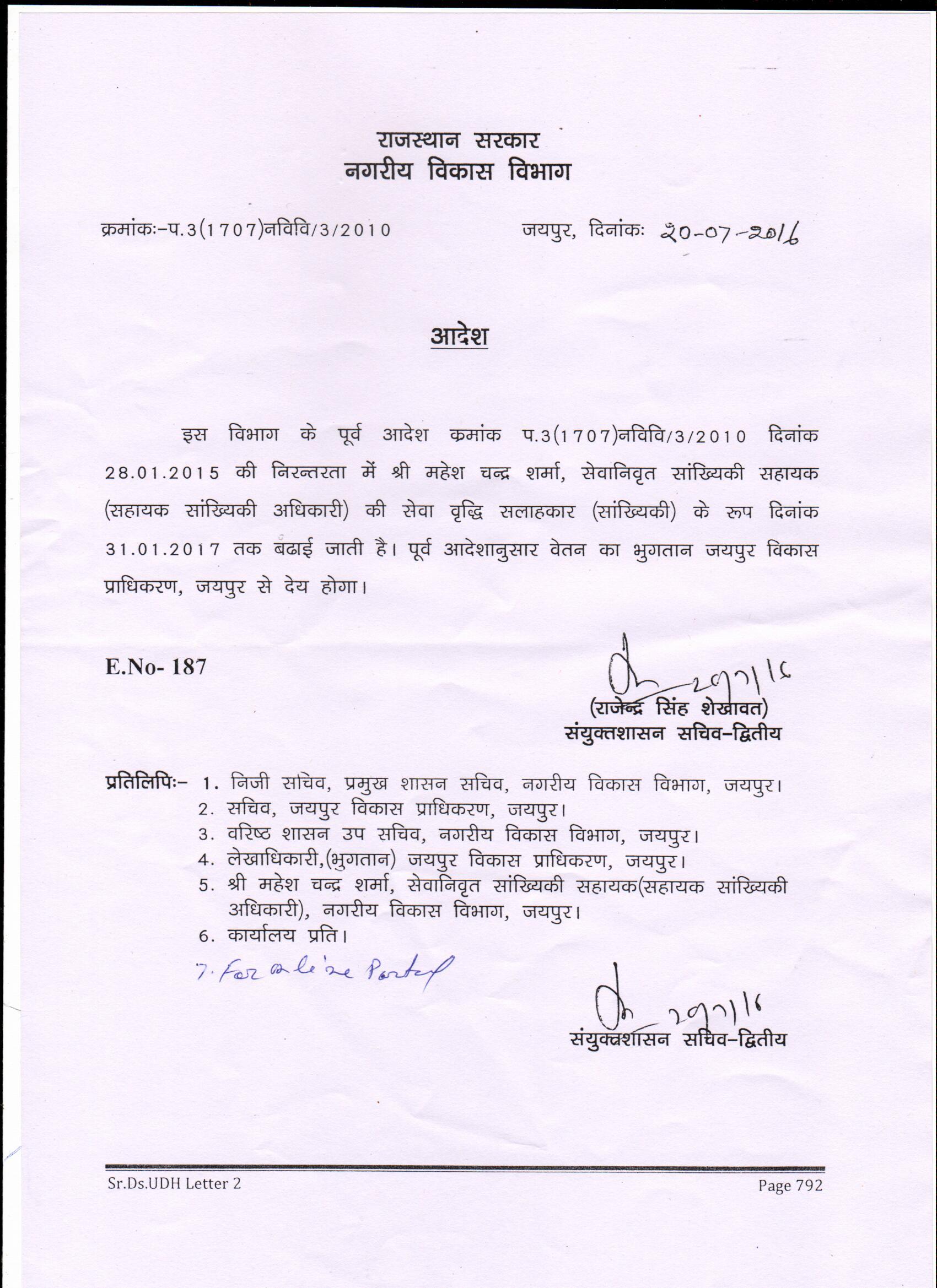 श्री महेश चन्द्र शर्मा, सेवानिवृत सांख्यिकी सहायक की सेवा वृदि सलाहकार (सांख्यिकी) के रूप में बढाने बाबत |