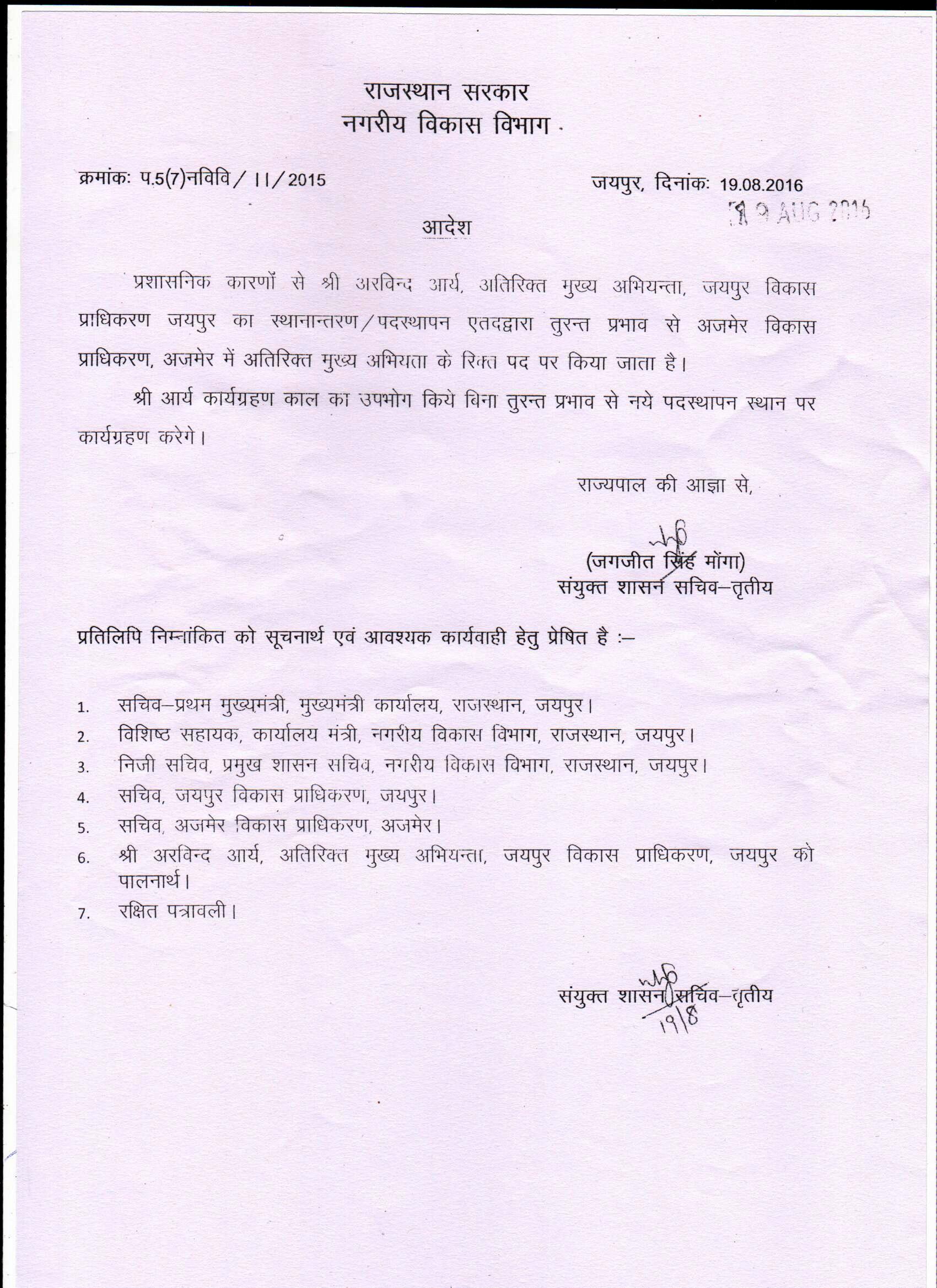 श्री अरविन्द आर्य, अतिरिक्त मुख्य अभियन्ता, जयपुर विकास प्राधिकरण, जयपुर के स्थानान्तरण/ पदस्थापन आदेश दिनांक 19.08.2016 |